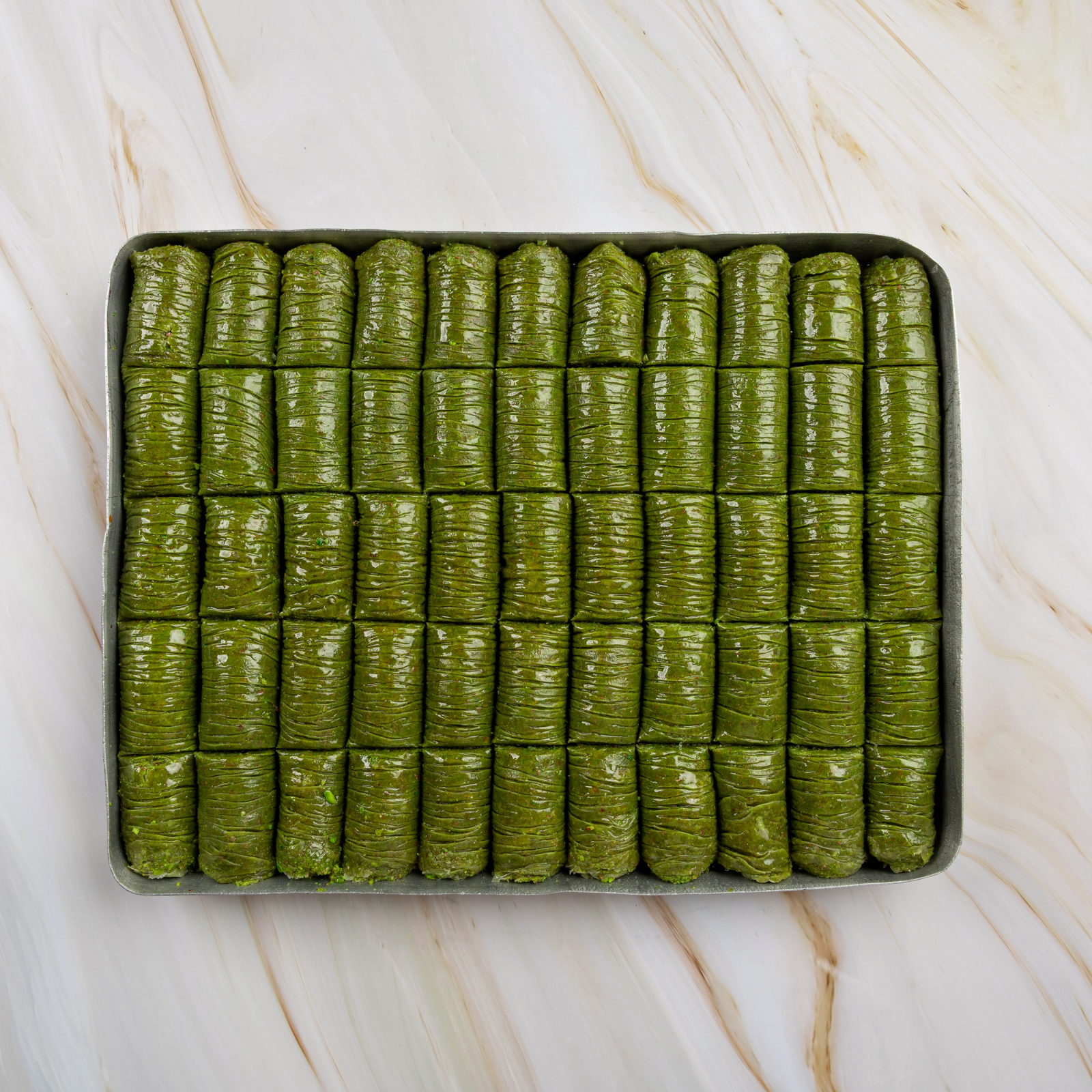 Kozal’s Pistachio Roll Baklava (Sarma) is a masterpiece of texture and taste — thin, buttery layers of phyllo wrapped tightly around finely ground Turkish pistachios, then baked to a delicate crisp and soaked lightly in syrup.
